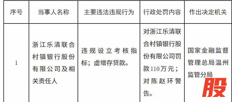 12月31日,国家金融监督管理总局温州监管分局行政处罚信息公开表显示,浙江乐清联合村镇银行股份有限公司及相关责任人因违规设立考核指标;虚增存贷款被罚款110万元;陈某环被警告。
