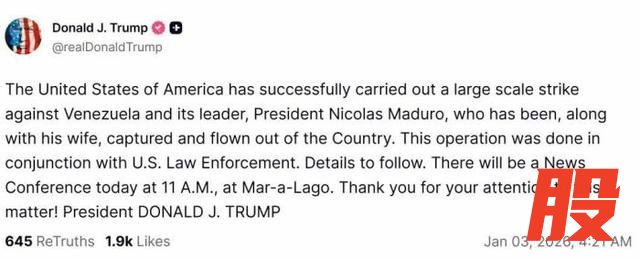 美国东部时间3日凌晨4:21左右:特朗普在社交媒体发文称,美方已成功对委内瑞拉实施打击,抓获马杜罗及其夫人,并带离委内瑞拉。