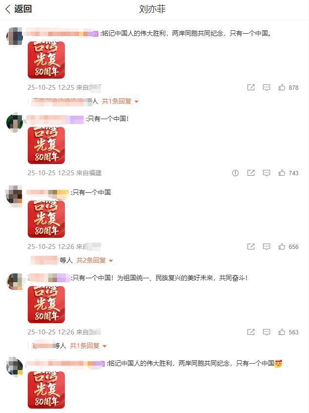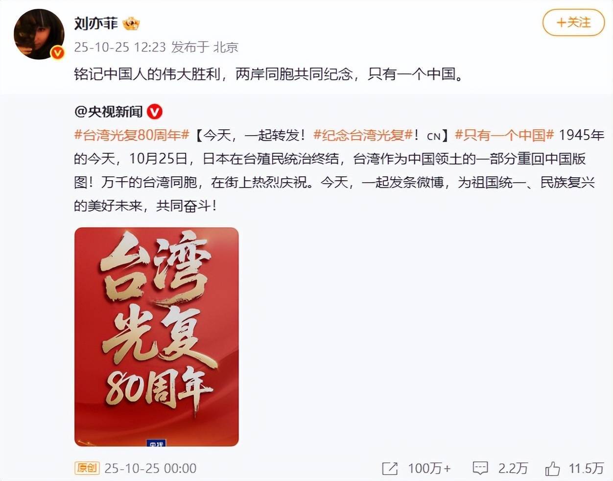 当天,刘亦菲在自己的社交账号上,转发了官方的纪念内容,配文“铭记中国人的伟大胜利,两岸同胞共同纪念,只有一个中国”。