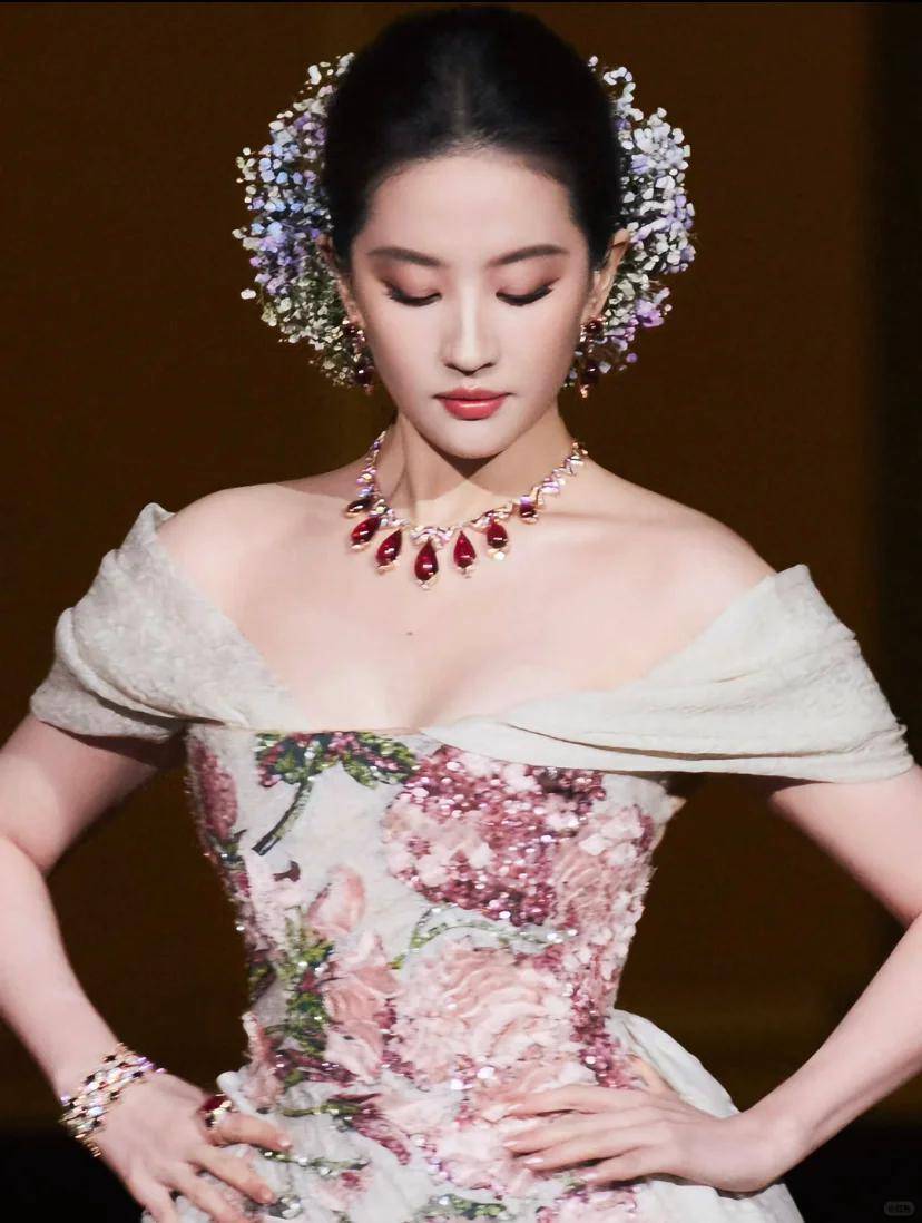 在合影前的活动红毯环节,刘亦菲被安排在了压轴的位置出场。