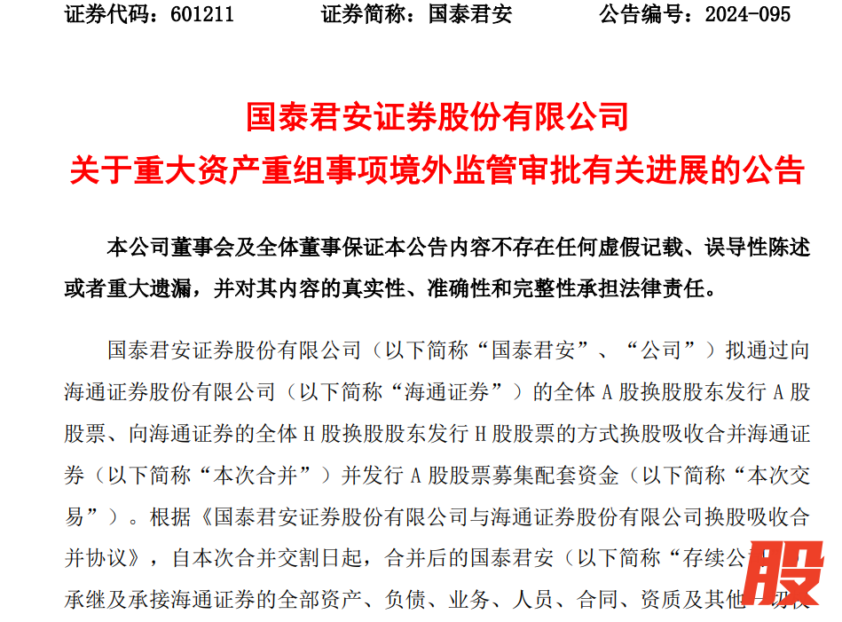 12月22日,国泰君安、海通证券发布公告,近日,香港证监会已根据香港《证券及期货条例》第132条,批准国泰君安作为存续公司,在本次合并后成为海通证券相关境外子公司大股东。