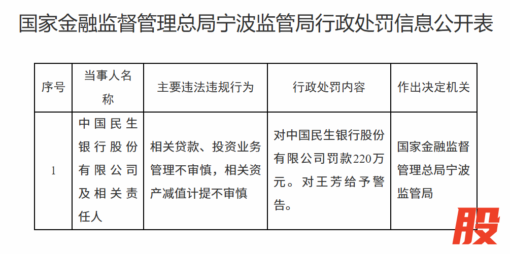 12月31日,国家金融监督管理总局宁波监管局行政处罚信息公开表显示,中国民生银行股份有限公司及相关责任人因相关贷款、投资业务管理不审慎,相关资产减值计提不审慎被罚款220万元。王某被警告。